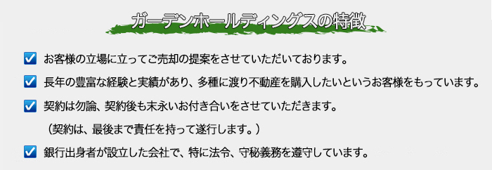 東京にある不動産会社の株式会社ガーデンホールディングス。長年の豊富な経験と実績からお客様の立場に立ってご売却の提案をさせていただきます。
